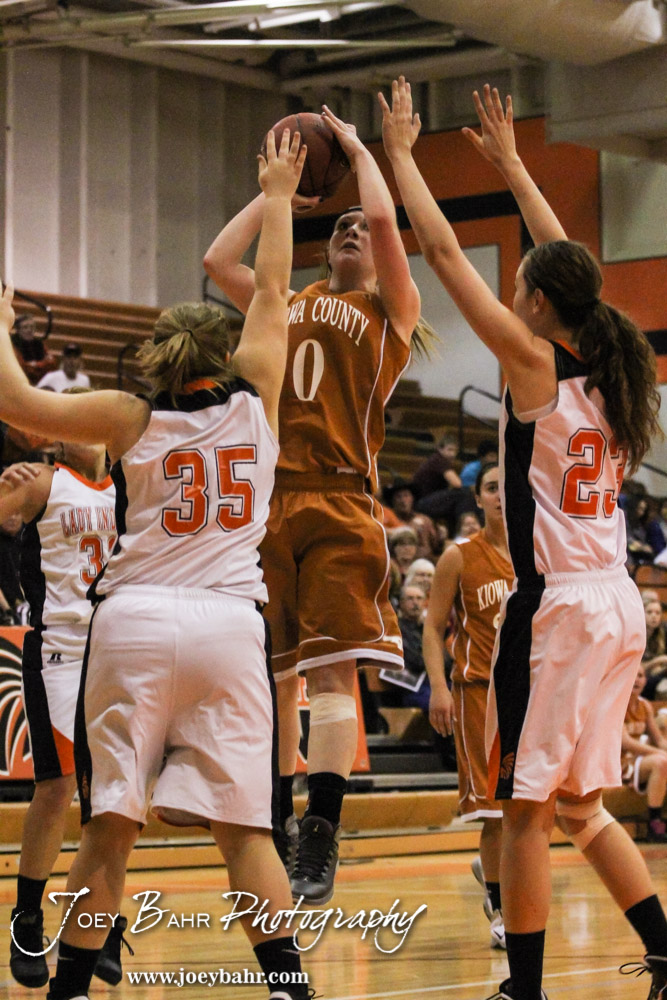 Kiowa County Lady Maverick Katelynn Gamble (#0) goes up for a shot while Larned Lady Indians Alexis Langdon (#35) and ShyAnn Robison (#23) defend during the Opening Round of the Seventh Annual Keady Basketball Classic matchup between the Kiowa County Lady Mavericks and the Larned Lady Indians with Kiowa County winning 34 to 19 at Marvin Webster Court in Larned, Kansas on December 10, 2013. (Photo: Joey Bahr, www.joeybahr.com)