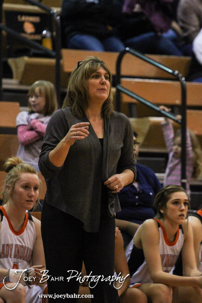 Larned Lady Indian Head Coach Tricia Prescott directs a play during the Opening Round of the Seventh Annual Keady Basketball Classic matchup between the Kiowa County Lady Mavericks and the Larned Lady Indians with Kiowa County winning 34 to 19 at Marvin Webster Court in Larned, Kansas on December 10, 2013. (Photo: Joey Bahr, www.joeybahr.com)
