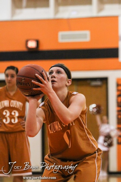Kiowa County Lady Maverick Katelynn Gamble (#0) shoots a free throw attempt during the Opening Round of the Seventh Annual Keady Basketball Classic matchup between the Kiowa County Lady Mavericks and the Larned Lady Indians with Kiowa County winning 34 to 19 at Marvin Webster Court in Larned, Kansas on December 10, 2013. (Photo: Joey Bahr, www.joeybahr.com)