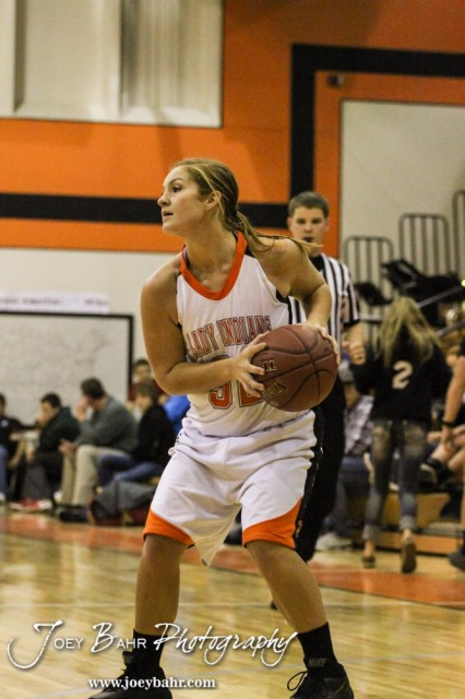 Larned Lady Indian Jessie Johnson (#32) looks for a teammate to pass to during the Opening Round of the Seventh Annual Keady Basketball Classic matchup between the Kiowa County Lady Mavericks and the Larned Lady Indians with Kiowa County winning 34 to 19 at Marvin Webster Court in Larned, Kansas on December 10, 2013. (Photo: Joey Bahr, www.joeybahr.com)