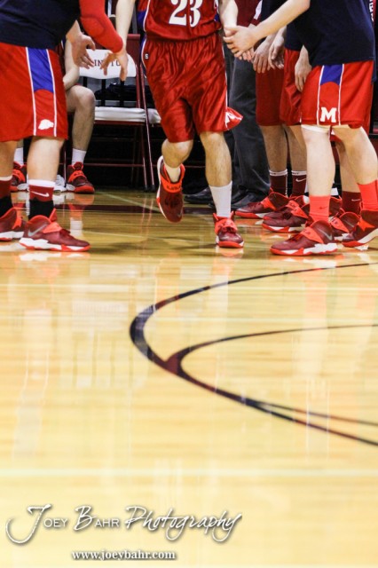 A view of the identical shoes of the Minneapolis Lions during the 2014 Hoisington Cardinal Winter Jam Boys Championship basketball game with the Minneapolis Lions versus the Victoria Knights with Minneapolis winning 57 to 47 at the Hoisington Activity Center in Hoisington, Kansas on January 25, 2014. (Photo: Joey Bahr, www.joeybahr.com)