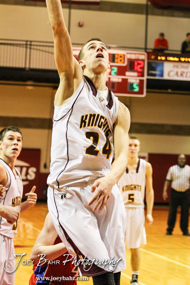 Victoria Knight Clayton Roth (#24) goes up for a layup during the 2014 Hoisington Cardinal Winter Jam Boys Championship basketball game with the Minneapolis Lions versus the Victoria Knights with Minneapolis winning 57 to 47 at the Hoisington Activity Center in Hoisington, Kansas on January 25, 2014. (Photo: Joey Bahr, www.joeybahr.com)