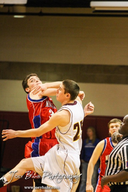 Minneapolis Lion John Kelly (#33) and Victoria Knight Noah Dreiling (#25) go up for the opening tipoff during the 2014 Hoisington Cardinal Winter Jam Boys Championship basketball game with the Minneapolis Lions versus the Victoria Knights with Minneapolis winning 57 to 47 at the Hoisington Activity Center in Hoisington, Kansas on January 25, 2014. (Photo: Joey Bahr, www.joeybahr.com)
