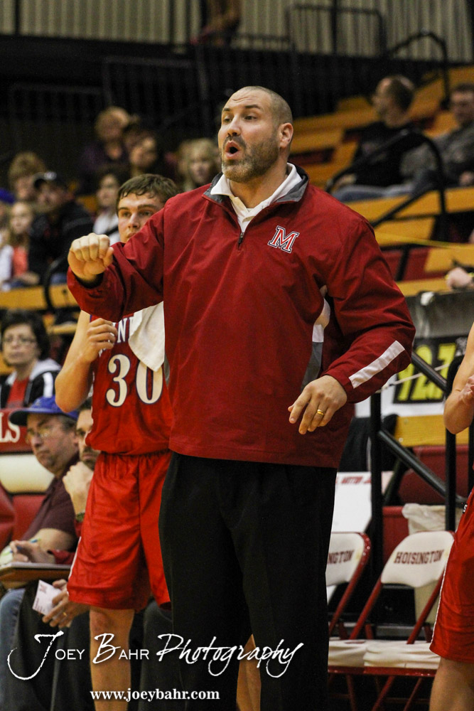 Minneapolis Lion Head Coach Erik Shupe calls out to his players during the 2014 Hoisington Cardinal Winter Jam Boys Championship basketball game with the Minneapolis Lions versus the Victoria Knights with Minneapolis winning 57 to 47 at the Hoisington Activity Center in Hoisington, Kansas on January 25, 2014. (Photo: Joey Bahr, www.joeybahr.com)