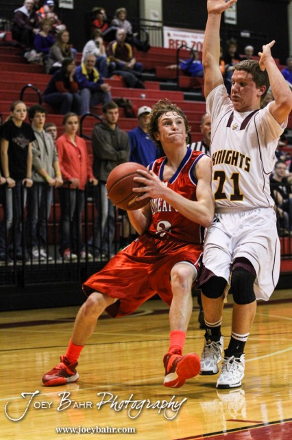 Victoria Knight Bryan Dome (#21) tries to block Minneapolis Lion Josh Macy (#2) during the 2014 Hoisington Cardinal Winter Jam Boys Championship basketball game with the Minneapolis Lions versus the Victoria Knights with Minneapolis winning 57 to 47 at the Hoisington Activity Center in Hoisington, Kansas on January 25, 2014. (Photo: Joey Bahr, www.joeybahr.com)