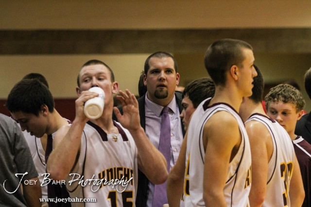 Victoria Knight Head Coach Stuart Moeckel looks at the scoreboard during a timeout during the 2014 Hoisington Cardinal Winter Jam Boys Championship basketball game with the Minneapolis Lions versus the Victoria Knights with Minneapolis winning 57 to 47 at the Hoisington Activity Center in Hoisington, Kansas on January 25, 2014. (Photo: Joey Bahr, www.joeybahr.com)