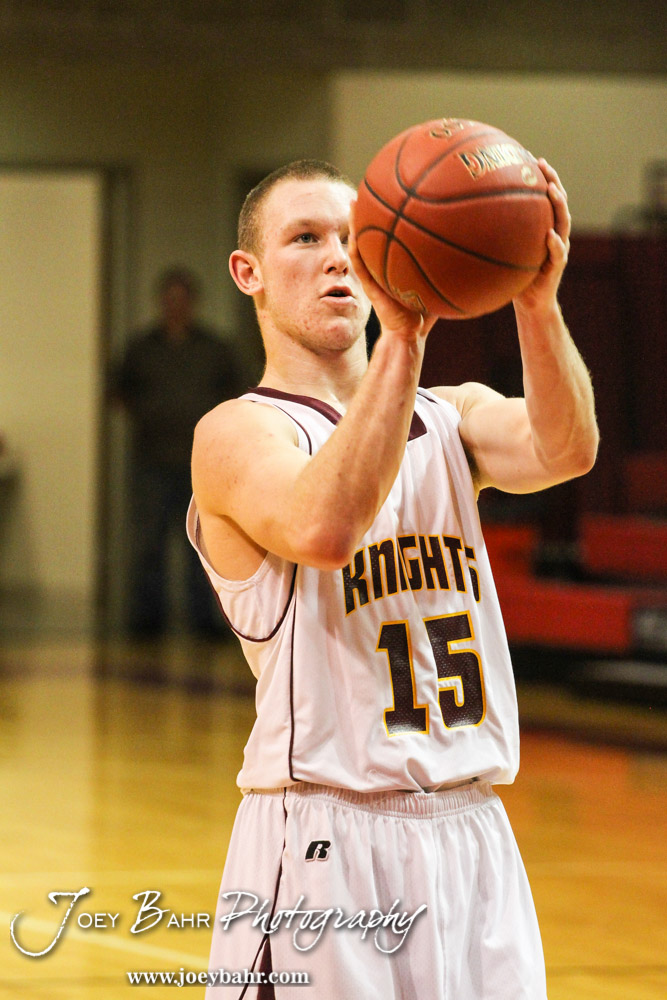 Victoria Knight Eric McAlonan (#15) shoots a free throw during the 2014 Hoisington Cardinal Winter Jam Boys Championship basketball game with the Minneapolis Lions versus the Victoria Knights with Minneapolis winning 57 to 47 at the Hoisington Activity Center in Hoisington, Kansas on January 25, 2014. (Photo: Joey Bahr, www.joeybahr.com)