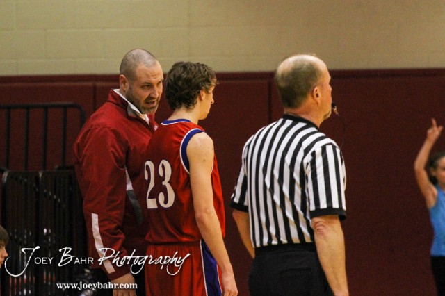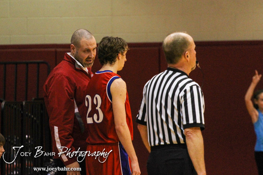 Minneapolis Lion Head Coach Erik Shupe talks to Brandon Davis (#23) during the 2014 Hoisington Cardinal Winter Jam Boys Championship basketball game with the Minneapolis Lions versus the Victoria Knights with Minneapolis winning 57 to 47 at the Hoisington Activity Center in Hoisington, Kansas on January 25, 2014. (Photo: Joey Bahr, www.joeybahr.com)