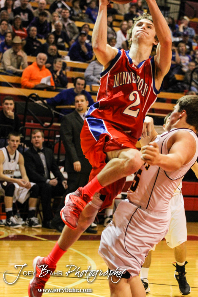 Minneapolis Lion Josh Macy (#2) goes up for a layup during the 2014 Hoisington Cardinal Winter Jam Boys Championship basketball game with the Minneapolis Lions versus the Victoria Knights with Minneapolis winning 57 to 47 at the Hoisington Activity Center in Hoisington, Kansas on January 25, 2014. (Photo: Joey Bahr, www.joeybahr.com)