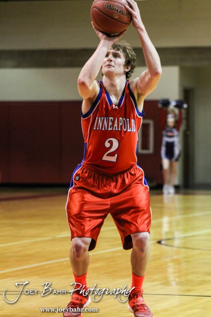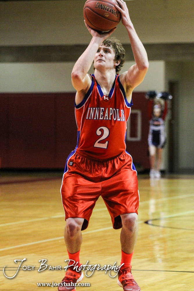 Minneapolis Lion Josh Macy (#2) shoots a free throw during the 2014 Hoisington Cardinal Winter Jam Boys Championship basketball game with the Minneapolis Lions versus the Victoria Knights with Minneapolis winning 57 to 47 at the Hoisington Activity Center in Hoisington, Kansas on January 25, 2014. (Photo: Joey Bahr, www.joeybahr.com)