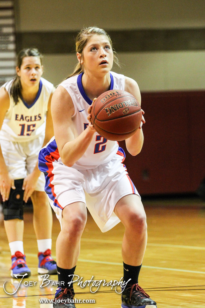 Ellinwood Lady Eagle Sophie Hayes (#2) shoots a free throw during the 2014 Hoisington Cardinal Winter Jam Girls Championship basketball game with the Ellinwood Lady Eagles versus the Minneapolis Lady Lions with Ellinwood winning 57 to 48 at the Hoisington Activity Center in Hoisington, Kansas on January 25, 2014. (Photo: Joey Bahr, www.joeybahr.com)