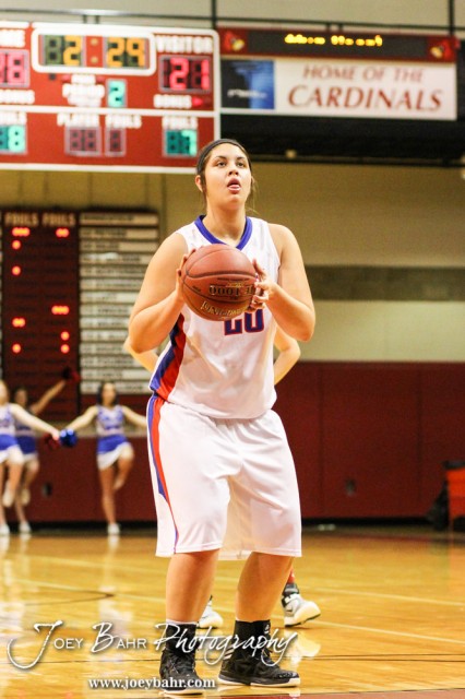 Ellinwood Lady Eagle Kelsea Ward (#20) shoots a free throw during the 2014 Hoisington Cardinal Winter Jam Girls Championship basketball game with the Ellinwood Lady Eagles versus the Minneapolis Lady Lions with Ellinwood winning 57 to 48 at the Hoisington Activity Center in Hoisington, Kansas on January 25, 2014. (Photo: Joey Bahr, www.joeybahr.com)