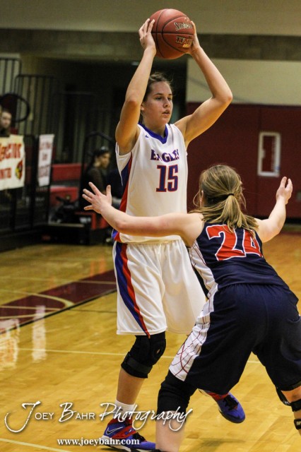 Ellinwood Lady Eagle Rachel Doll (#15) looks for a teammate to pass the ball to during the 2014 Hoisington Cardinal Winter Jam Girls Championship basketball game with the Ellinwood Lady Eagles versus the Minneapolis Lady Lions with Ellinwood winning 57 to 48 at the Hoisington Activity Center in Hoisington, Kansas on January 25, 2014. (Photo: Joey Bahr, www.joeybahr.com)