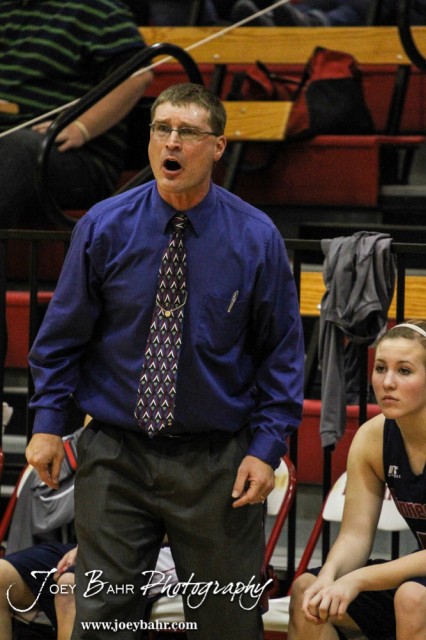Minneapolis Lady Lion Assistant Coach John Darrow calls out to a player during the 2014 Hoisington Cardinal Winter Jam Girls Championship basketball game with the Ellinwood Lady Eagles versus the Minneapolis Lady Lions with Ellinwood winning 57 to 48 at the Hoisington Activity Center in Hoisington, Kansas on January 25, 2014. (Photo: Joey Bahr, www.joeybahr.com)