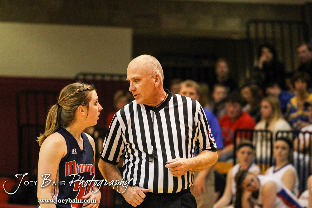 Minneapolis Lady Lion Mara Pounds (#24) discusses a previous play with a referee during the 2014 Hoisington Cardinal Winter Jam Girls Championship basketball game with the Ellinwood Lady Eagles versus the Minneapolis Lady Lions with Ellinwood winning 57 to 48 at the Hoisington Activity Center in Hoisington, Kansas on January 25, 2014. (Photo: Joey Bahr, www.joeybahr.com)