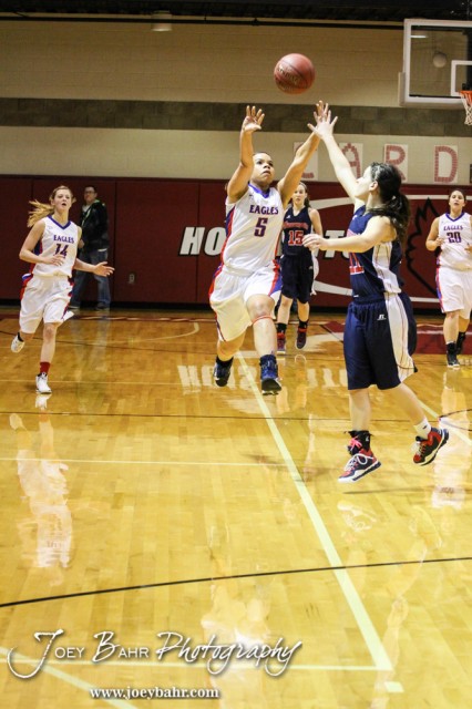 Ellinwood Lady Eagle Twany Arndt (#5) shoots a shot at the Halftime buzzer during the 2014 Hoisington Cardinal Winter Jam Girls Championship basketball game with the Ellinwood Lady Eagles versus the Minneapolis Lady Lions with Ellinwood winning 57 to 48 at the Hoisington Activity Center in Hoisington, Kansas on January 25, 2014. (Photo: Joey Bahr, www.joeybahr.com)