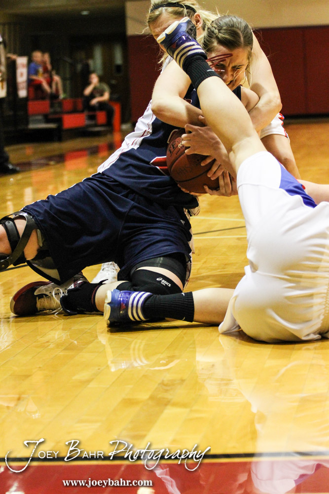 Minneapolis Lady Lion Mara Pounds (#24) tries to hold on to the ball from two Ellinwood Lady Eagles during the 2014 Hoisington Cardinal Winter Jam Girls Championship basketball game with the Ellinwood Lady Eagles versus the Minneapolis Lady Lions with Ellinwood winning 57 to 48 at the Hoisington Activity Center in Hoisington, Kansas on January 25, 2014. (Photo: Joey Bahr, www.joeybahr.com)