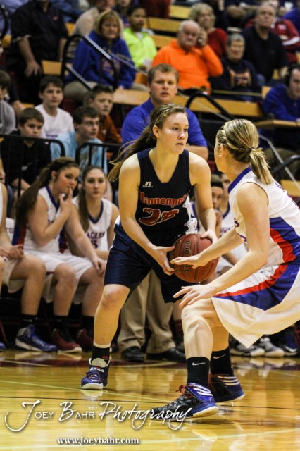 Minneapolis Lady Lion Lindsay Shupe (#22) looks for a teammate to pass the ball to during the 2014 Hoisington Cardinal Winter Jam Girls Championship basketball game with the Ellinwood Lady Eagles versus the Minneapolis Lady Lions with Ellinwood winning 57 to 48 at the Hoisington Activity Center in Hoisington, Kansas on January 25, 2014. (Photo: Joey Bahr, www.joeybahr.com)