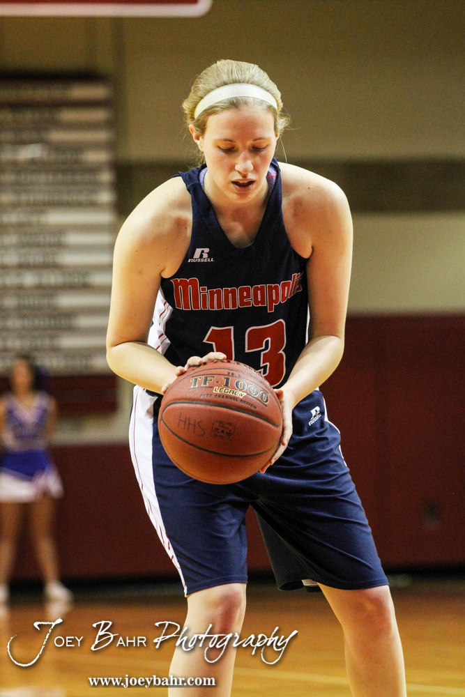 Minneapolis Lady Lion Jacee Owens (#13) shoots a free throw during the 2014 Hoisington Cardinal Winter Jam Girls Championship basketball game with the Ellinwood Lady Eagles versus the Minneapolis Lady Lions with Ellinwood winning 57 to 48 at the Hoisington Activity Center in Hoisington, Kansas on January 25, 2014. (Photo: Joey Bahr, www.joeybahr.com)