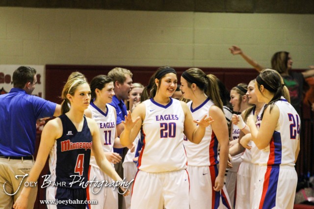 during the 2014 Hoisington Cardinal Winter Jam Girls Championship basketball game with the Ellinwood Lady Eagles versus the Minneapolis Lady Lions with Ellinwood winning 57 to 48