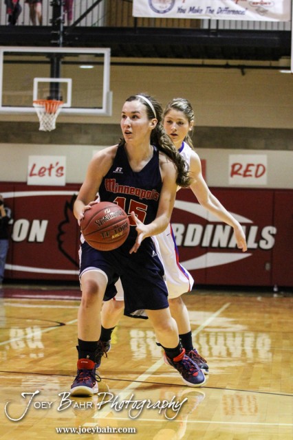 Minneapolis Lady Lion Kynedi Allison (#15) drives towards the basket during the 2014 Hoisington Cardinal Winter Jam Girls Championship basketball game with the Ellinwood Lady Eagles versus the Minneapolis Lady Lions with Ellinwood winning 57 to 48 at the Hoisington Activity Center in Hoisington, Kansas on January 25, 2014. (Photo: Joey Bahr, www.joeybahr.com)