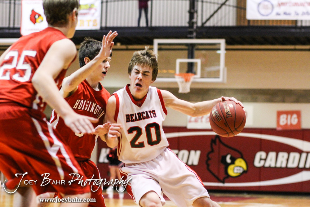 Ellsworth Bearcat Nick Flynn (#20) drives in on Hoisington Cardinal Taylor Richter (#3) during the 2014 Hoisington Cardinal Winter Jam Consolation Round basketball game with the Hoisington Cardinals versus the Ellsworth Bearcats with Hoisington winning 32 to 27 at the Hoisington Activity Center in Hoisington, Kansas on January 23, 2014. (Photo: Joey Bahr, www.joeybahr.com)