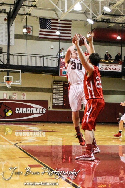 Ellsworth Bearcat Lucas Barta (#30) takes a shot as Hoisington Cardinal Ryan Broeder (#25) defends during the 2014 Hoisington Cardinal Winter Jam Consolation Round basketball game with the Hoisington Cardinals versus the Ellsworth Bearcats with Hoisington winning 32 to 27 at the Hoisington Activity Center in Hoisington, Kansas on January 23, 2014. (Photo: Joey Bahr, www.joeybahr.com)