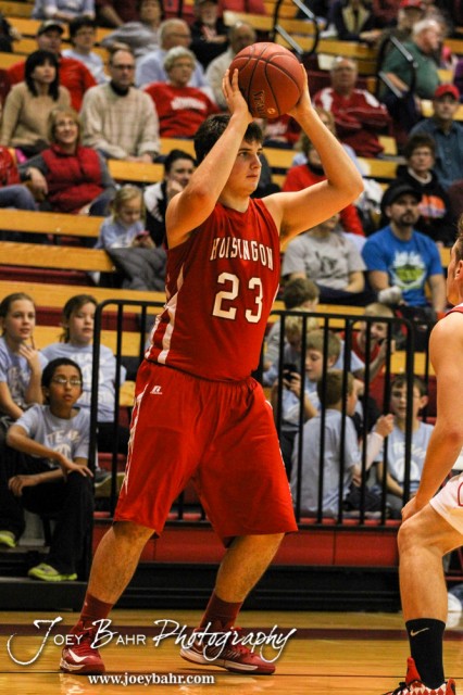 Hoisington Cardinal Christopher Wright (#23) looks for a teammate to pass the ball to during the 2014 Hoisington Cardinal Winter Jam Consolation Round basketball game with the Hoisington Cardinals versus the Ellsworth Bearcats with Hoisington winning 32 to 27 at the Hoisington Activity Center in Hoisington, Kansas on January 23, 2014. (Photo: Joey Bahr, www.joeybahr.com)