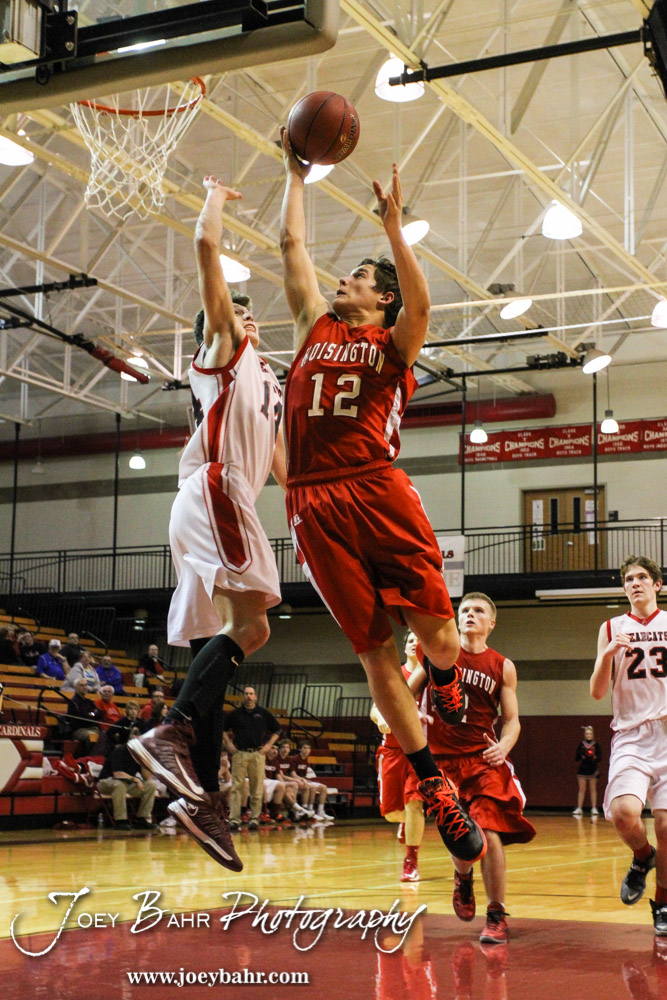 Ellsworth Bearcat Takota Anderson (#14) tries to defend the basket from Hoisington Cardinal Steffan Dolechek’s (#12) layup during the 2014 Hoisington Cardinal Winter Jam Consolation Round basketball game with the Hoisington Cardinals versus the Ellsworth Bearcats with Hoisington winning 32 to 27 at the Hoisington Activity Center in Hoisington, Kansas on January 23, 2014. (Photo: Joey Bahr, www.joeybahr.com)