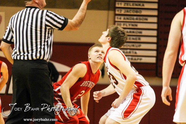 Hoisington Cardinal Trent Schremmer (#2) and Ellsworth Bearcat Matthew Keener (#23) prepare to jump for the opening tipoff during the 2014 Hoisington Cardinal Winter Jam Consolation Round basketball game with the Hoisington Cardinals versus the Ellsworth Bearcats with Hoisington winning 32 to 27 at the Hoisington Activity Center in Hoisington, Kansas on January 23, 2014. (Photo: Joey Bahr, www.joeybahr.com)