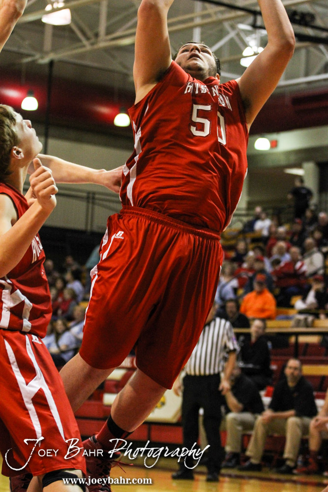 Hoisington Cardinal Seth Owen (#50) goes up for a layup during the 2014 Hoisington Cardinal Winter Jam Consolation Round basketball game with the Hoisington Cardinals versus the Ellsworth Bearcats with Hoisington winning 32 to 27 at the Hoisington Activity Center in Hoisington, Kansas on January 23, 2014. (Photo: Joey Bahr, www.joeybahr.com)
