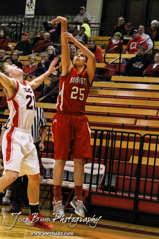 Hoisington Cardinal Ryan Broeder (#25) takes a three point shot during the 2014 Hoisington Cardinal Winter Jam Consolation Round basketball game with the Hoisington Cardinals versus the Ellsworth Bearcats with Hoisington winning 32 to 27 at the Hoisington Activity Center in Hoisington, Kansas on January 23, 2014. (Photo: Joey Bahr, www.joeybahr.com)