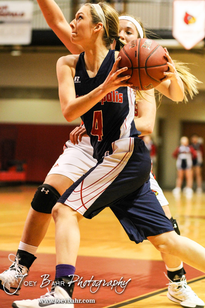 Minneapolis Lady Lion Lucy Giles (#4) drives to the basket during the 2014 Hoisington Cardinal Winter Jam Semi-Final basketball game with the Minneapolis Lady Lions versus the Hoisington Lady Cardinals with Minneapolis winning 36 to 33 at the Hoisington Activity Center in Hoisington, Kansas on January 24, 2014. (Photo: Joey Bahr, www.joeybahr.com)