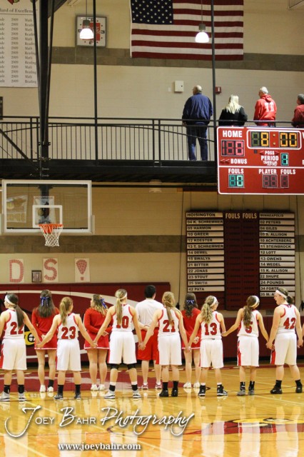 The Hoisington Lady Cardinals line up for the National Anthem during the 2014 Hoisington Cardinal Winter Jam Semi-Final basketball game with the Minneapolis Lady Lions versus the Hoisington Lady Cardinals with Minneapolis winning 36 to 33 at the Hoisington Activity Center in Hoisington, Kansas on January 24, 2014. (Photo: Joey Bahr, www.joeybahr.com)