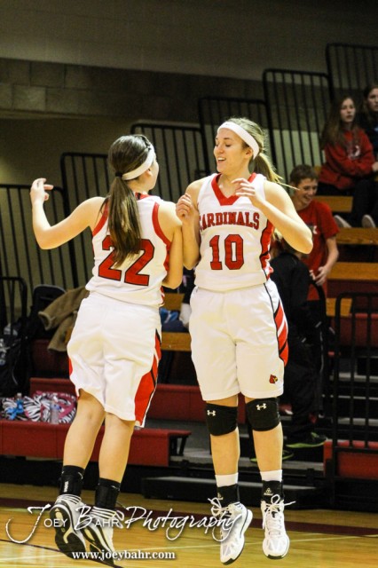 Hoisington Lady Cardinal Marisa Jonas (#22) greets Jordin Greer (#10) during the 2014 Hoisington Cardinal Winter Jam Semi-Final basketball game with the Minneapolis Lady Lions versus the Hoisington Lady Cardinals with Minneapolis winning 36 to 33 at the Hoisington Activity Center in Hoisington, Kansas on January 24, 2014. (Photo: Joey Bahr, www.joeybahr.com)