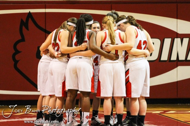 The Hoisington Lady Cardinals huddle up before tipoff during the 2014 Hoisington Cardinal Winter Jam Semi-Final basketball game with the Minneapolis Lady Lions versus the Hoisington Lady Cardinals with Minneapolis winning 36 to 33 at the Hoisington Activity Center in Hoisington, Kansas on January 24, 2014. (Photo: Joey Bahr, www.joeybahr.com)