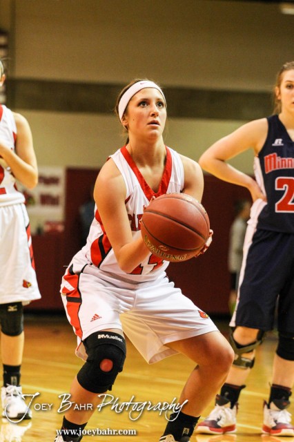 Hoisington Lady Cardinal Abbi Demel (#14) shoots a free throw during the 2014 Hoisington Cardinal Winter Jam Semi-Final basketball game with the Minneapolis Lady Lions versus the Hoisington Lady Cardinals with Minneapolis winning 36 to 33 at the Hoisington Activity Center in Hoisington, Kansas on January 24, 2014. (Photo: Joey Bahr, www.joeybahr.com)