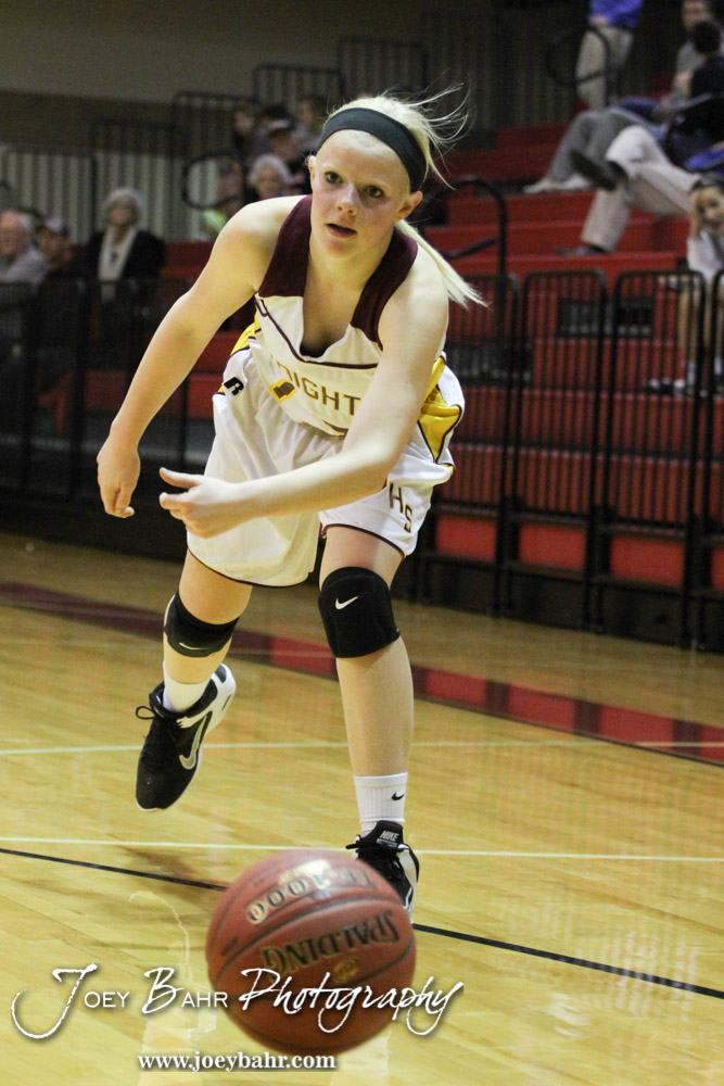 Victoria Lady Knight Kiley Schmidtberger (#13) passes the ball to a teammate during the 2014 Hoisington Cardinal Winter Jam First Round basketball game with the Victoria Lady Knights versus the Hoisington Lady Cardinals with Hoisington winning 60 to 46 in Hoisington Activity Center in Hoisington, Kansas on January 21, 2014. (Photo: Joey Bahr, www.joeybahr.com)