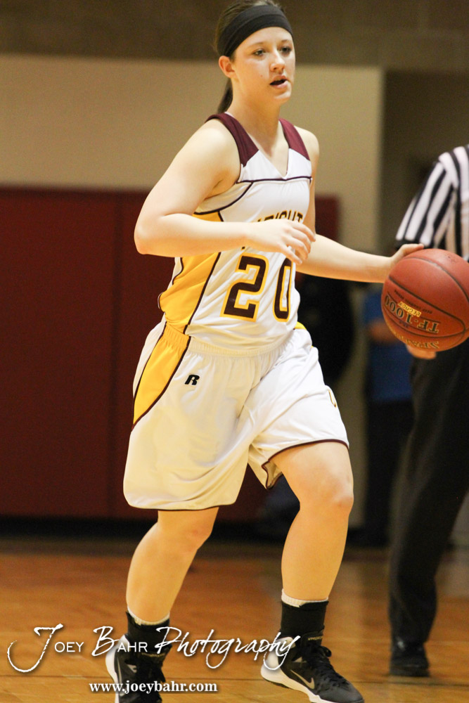 Victoria Lady Knight Rylee Broyles (#20) dribbles the ball during the 2014 Hoisington Cardinal Winter Jam First Round basketball game with the Victoria Lady Knights versus the Hoisington Lady Cardinals with Hoisington winning 60 to 46 in Hoisington Activity Center in Hoisington, Kansas on January 21, 2014. (Photo: Joey Bahr, www.joeybahr.com)