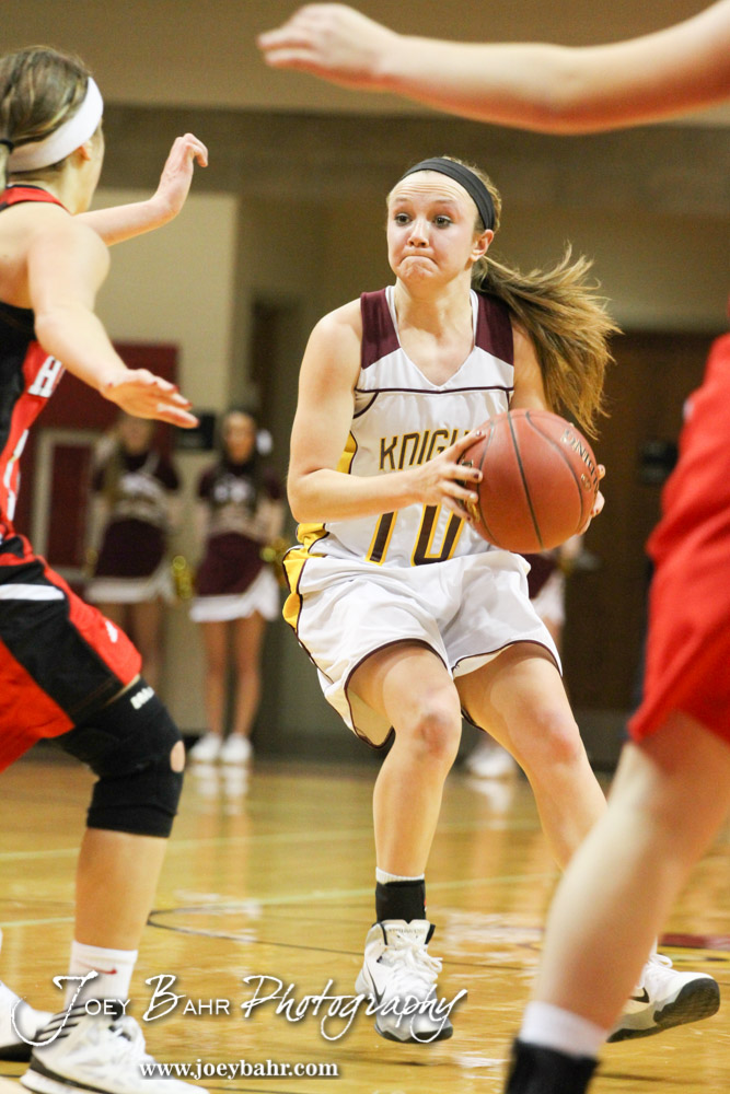 Victoria Lady Knight Kristin Huser (#10) looks for a whole in the Hoisington Lady Cardinal defense during the 2014 Hoisington Cardinal Winter Jam First Round basketball game with the Victoria Lady Knights versus the Hoisington Lady Cardinals with Hoisington winning 60 to 46 in Hoisington Activity Center in Hoisington, Kansas on January 21, 2014. (Photo: Joey Bahr, www.joeybahr.com)