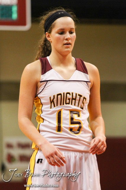 Victoria Lady Knight Audra Nowak (#15) prepares to shoot a free throw attempt during the 2014 Hoisington Cardinal Winter Jam First Round basketball game with the Victoria Lady Knights versus the Hoisington Lady Cardinals with Hoisington winning 60 to 46 in Hoisington Activity Center in Hoisington, Kansas on January 21, 2014. (Photo: Joey Bahr, www.joeybahr.com)