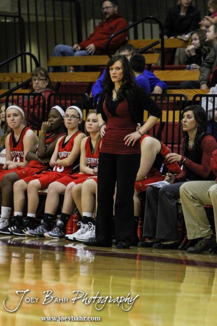 Hoisington Lady Cardinal Head Coach Mandy Mason watches a play unfold during the 2014 Hoisington Cardinal Winter Jam First Round basketball game with the Victoria Lady Knights versus the Hoisington Lady Cardinals with Hoisington winning 60 to 46 in Hoisington Activity Center in Hoisington, Kansas on January 21, 2014. (Photo: Joey Bahr, www.joeybahr.com)