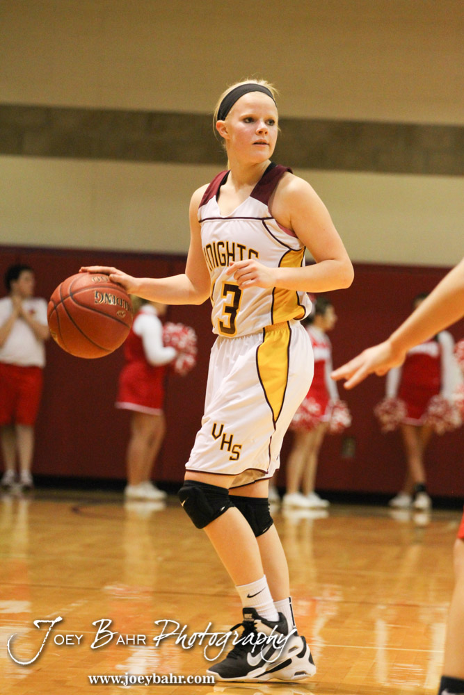 Victoria Lady Knight Kiley Schmidtberger (#13) looks for a teammate to pass the ball to during the 2014 Hoisington Cardinal Winter Jam First Round basketball game with the Victoria Lady Knights versus the Hoisington Lady Cardinals with Hoisington winning 60 to 46 in Hoisington Activity Center in Hoisington, Kansas on January 21, 2014. (Photo: Joey Bahr, www.joeybahr.com)