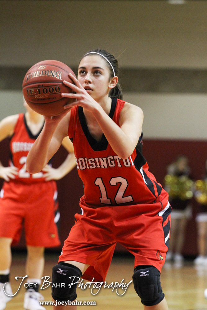 Hoisington Lady Cardinal Rylie Koester (#12) shoots a free throw attempt during the 2014 Hoisington Cardinal Winter Jam First Round basketball game with the Victoria Lady Knights versus the Hoisington Lady Cardinals with Hoisington winning 60 to 46 in Hoisington Activity Center in Hoisington, Kansas on January 21, 2014. (Photo: Joey Bahr, www.joeybahr.com)