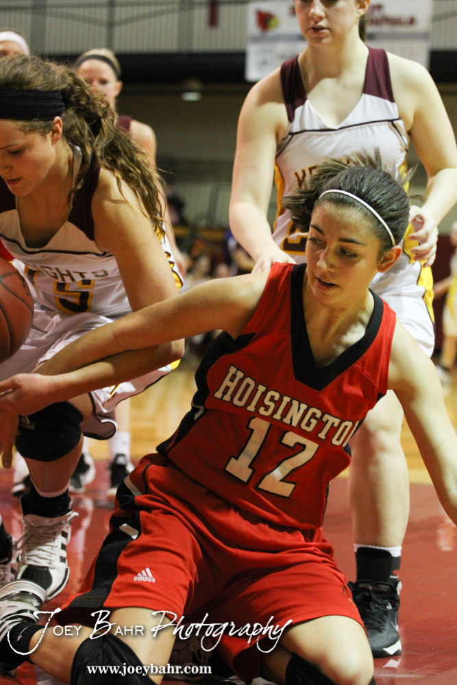 Hoisington Lady Cardinal Rylie Koester (#12) dives for a loose ball during the 2014 Hoisington Cardinal Winter Jam First Round basketball game with the Victoria Lady Knights versus the Hoisington Lady Cardinals with Hoisington winning 60 to 46 in Hoisington Activity Center in Hoisington, Kansas on January 21, 2014. (Photo: Joey Bahr, www.joeybahr.com)