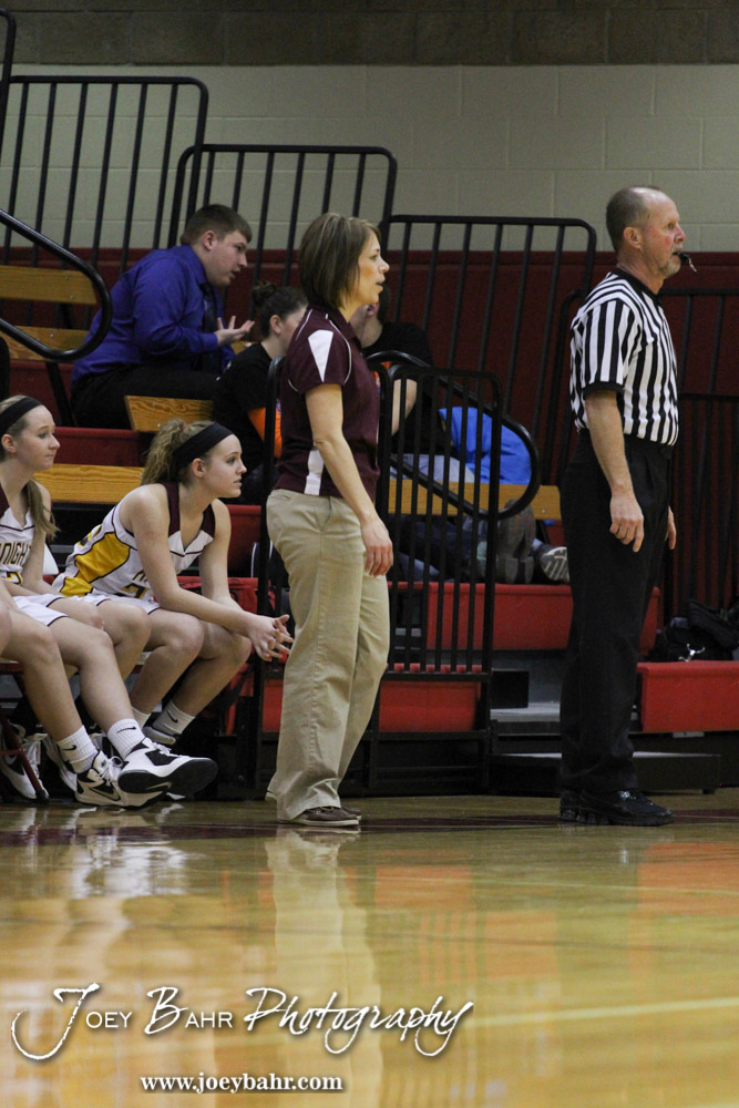 Victoria Lady Knight Head Coach Anne Dinkel discusses a call with a referee during the 2014 Hoisington Cardinal Winter Jam First Round basketball game with the Victoria Lady Knights versus the Hoisington Lady Cardinals with Hoisington winning 60 to 46 in Hoisington Activity Center in Hoisington, Kansas on January 21, 2014. (Photo: Joey Bahr, www.joeybahr.com)