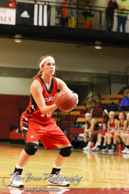 Hoisington Lady Cardinal Jordin Greer (#10) shoots a free throw attempt during the 2014 Hoisington Cardinal Winter Jam First Round basketball game with the Victoria Lady Knights versus the Hoisington Lady Cardinals with Hoisington winning 60 to 46 in Hoisington Activity Center in Hoisington, Kansas on January 21, 2014. (Photo: Joey Bahr, www.joeybahr.com)