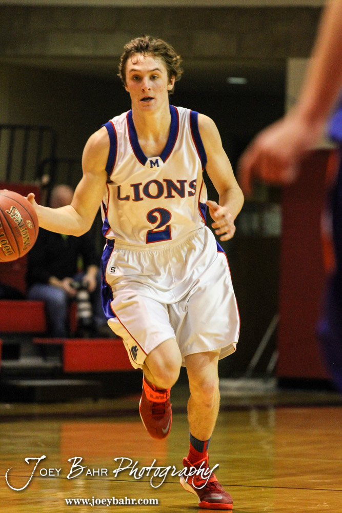 Minneapolis Lion Josh Macy (#2) dribbles down the court during the 2014 Hoisington Cardinal Winter Jam Semi-Final basketball game with the Minneapolis Lions versus the Otis-Bison Cougars with Minneapolis winning 57 to 32 at the Hoisington Activity Center in Hoisington, Kansas on January 24, 2014. (Photo: Joey Bahr, www.joeybahr.com)