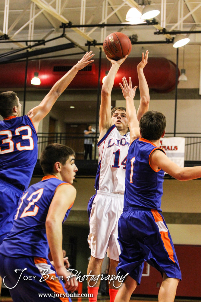 Minneapolis Lion Gage Mortimer (#14) takes a shot over the Otis-Bison Cougar defense during the 2014 Hoisington Cardinal Winter Jam Semi-Final basketball game with the Minneapolis Lions versus the Otis-Bison Cougars with Minneapolis winning 57 to 32 at the Hoisington Activity Center in Hoisington, Kansas on January 24, 2014. (Photo: Joey Bahr, www.joeybahr.com)