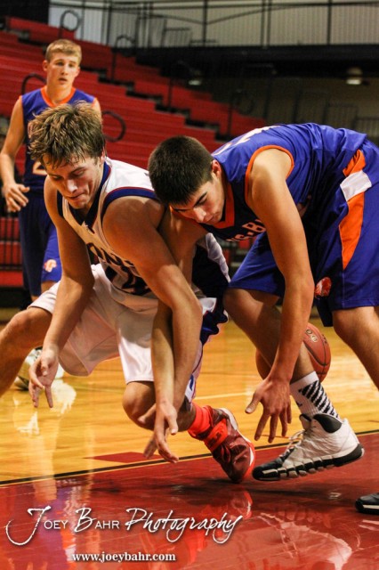 Minneapolis Lion Gage Mortimer (#14) and Otis-Bison Cougar Hayden Maier (#12) scramble for a loose ball during the 2014 Hoisington Cardinal Winter Jam Semi-Final basketball game with the Minneapolis Lions versus the Otis-Bison Cougars with Minneapolis winning 57 to 32 at the Hoisington Activity Center in Hoisington, Kansas on January 24, 2014. (Photo: Joey Bahr, www.joeybahr.com)